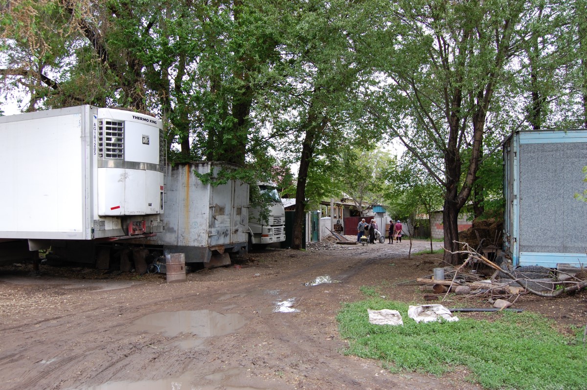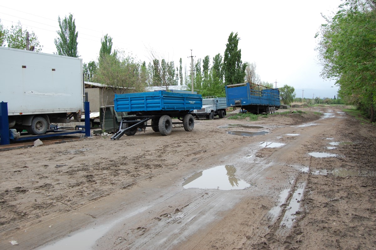 Другой предприимчивый сельчанин по имени Мухамбет организовал СТО для большегрузных автомобилей. Буквально в десяти шагах от канала несколько грузовиков на ремонте. Установлен подъемник.