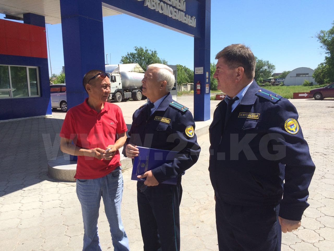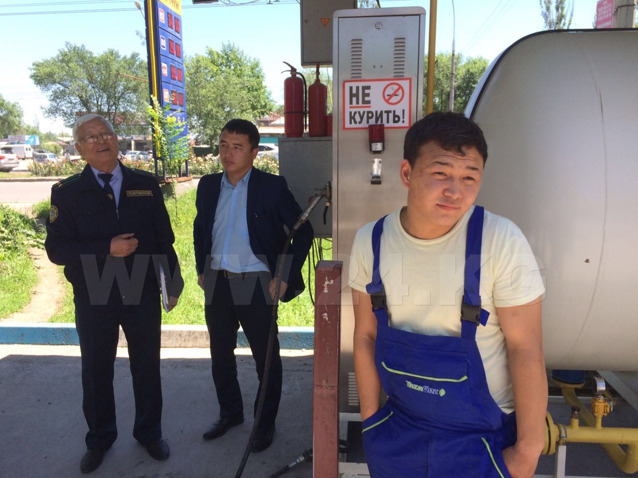 Оператор станции Айбек Жушалиев, увидев людей в форме, спешно начал звонить своему руководству и лишь затем подошел к проверяющим и выслушал их замечания. Их начал перечислять заведующий отделом промышленной безопасности Госэкотехинспекции Аман Махмутов: «Во-первых, у вас нет удостоверения, подтверждающего, что вы прошли специальные курсы и имеете право работать на АЗС. Резервуар под давлением, в нем газ, который в случае утечки может взорваться. По нормам он должен находиться под землей, как это сделано на соседней АЗС. Также есть сомнения, что данный сосуд зарегистрирован в реестре Госгортехнадзора. Кроме того, отсутствуют инструкции и схемы».