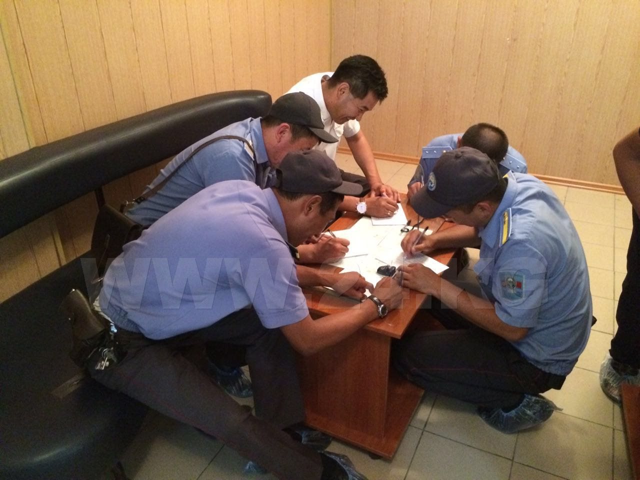 Экипажи патрульной милиции один за другим подъезжают к Республиканскому центру крови - видимо, по мере освобождения. В коридоре сотрудники УПМ ГУВД коллективно заполняют анкеты.