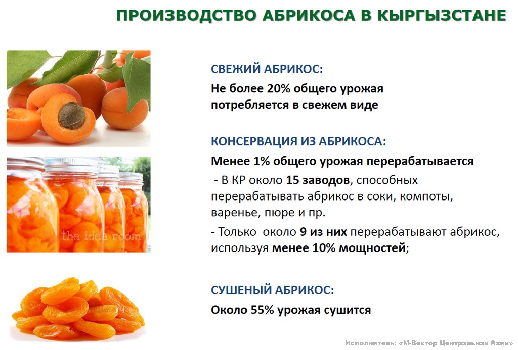 Первый. Абрикоса в настоящее время выращивают от 50 до 70 тысяч тонн, в зависимости от сезона и урожайности, в основном (68 процентов) в Баткене, немного на Иссык-Куле, в Чуе, Джалал-Абаде, Оше. Что дальше происходит?
