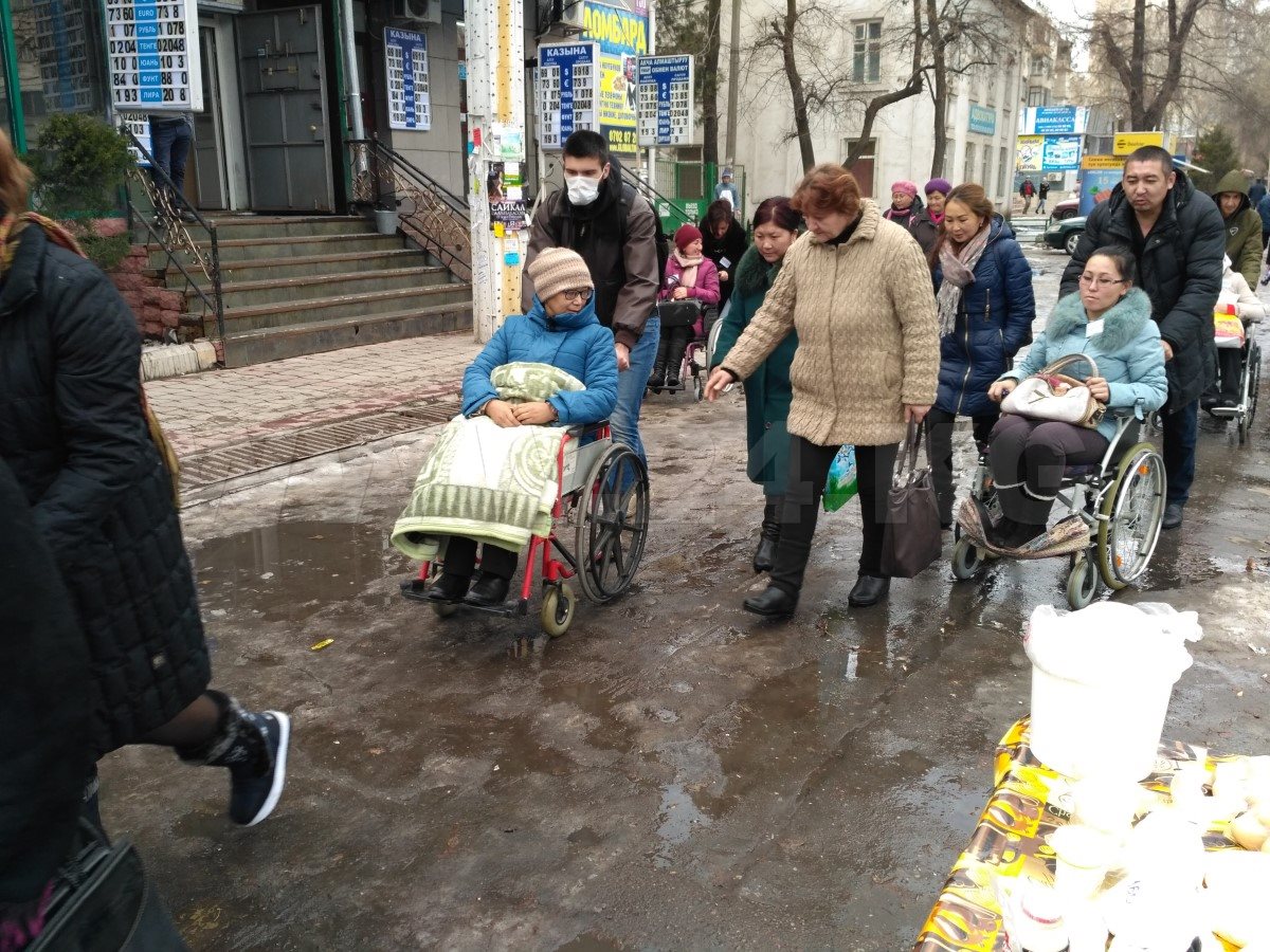 По слякотному Бишкеку вниз по улице Байтика баатыра с улыбкой на лицах едут инвалиды-колясочники. Прохожие с интересом наблюдают за необычной процессией.