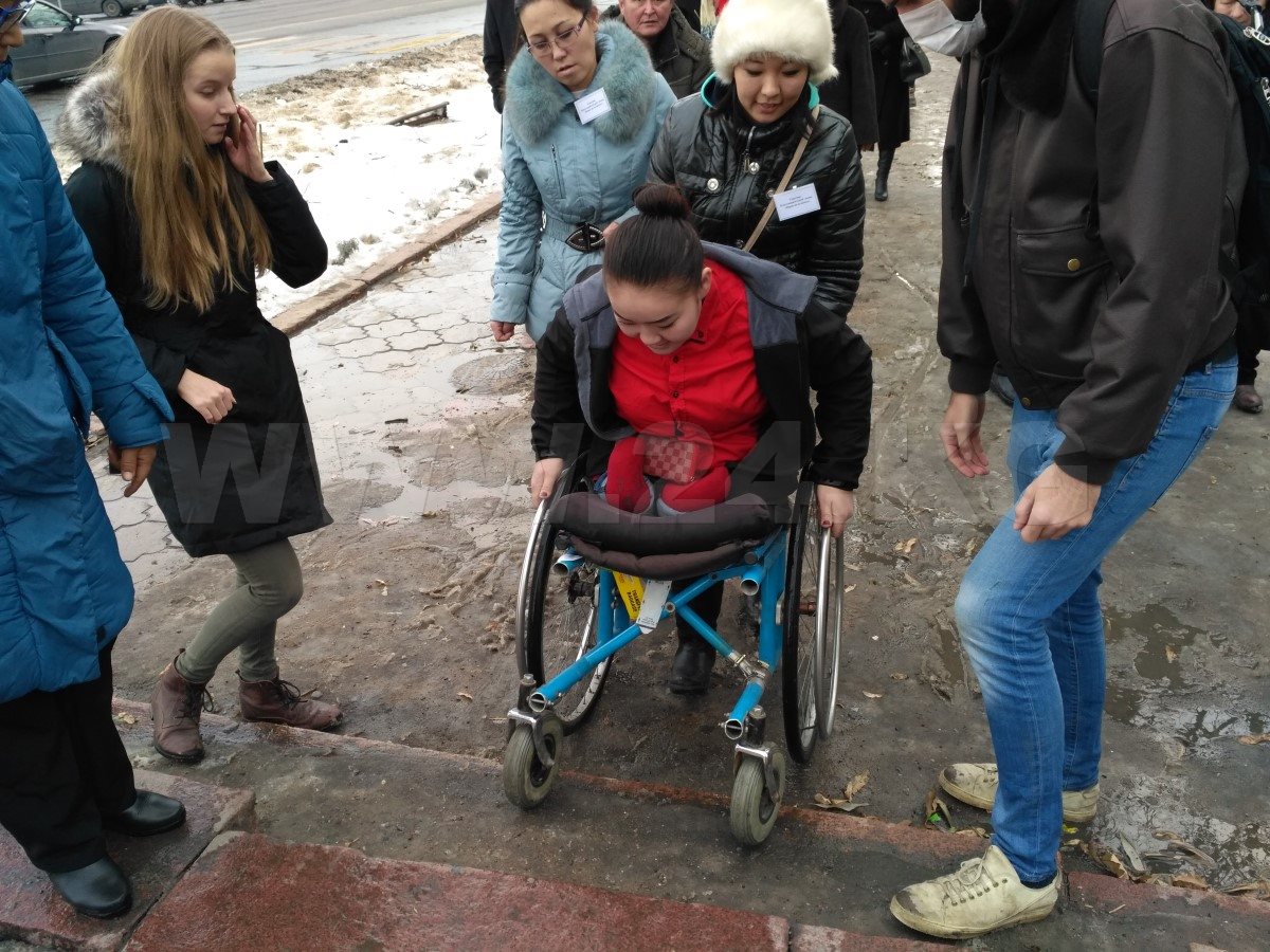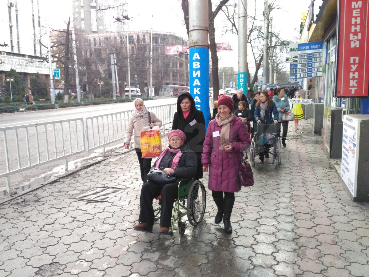 Целым испытанием для участников марша стала подземка на пересечении улицы Байтика баатыра и проспекта Чуй. Чтобы узнать, насколько это трудно, участники спустились и поднялись наверх. За старый деревянный поручень еще советских времен нужно браться осторожно, иначе рискуешь занозить руку. К тому же самостоятельно спуститься практически невозможно. Сделать это можно только с помощью сопровождающего. Благо, люди наши неравнодушные. Несколько молодых людей предложили помощь. А один мальчик даже пару раз сильно пихнул своего несмышленого братишку за то, что он нелестно отозвался об участниках шествия.
