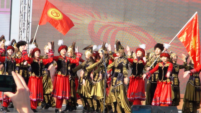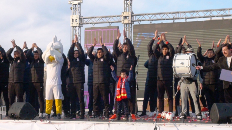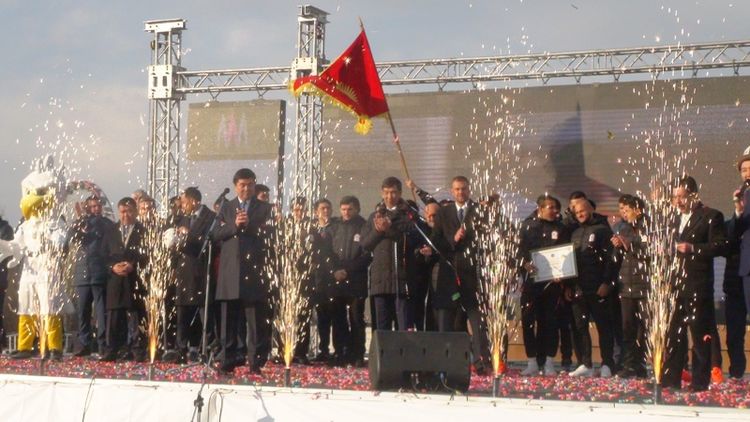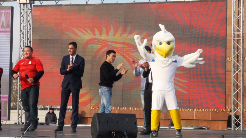 На столичной площади Ала-Тоо сегодня прошло торжество в честь сборной по футболу, вернувшейся с Кубка Азии. Оно включало в себя выступления артистов и поздравления команды. Приветствовать ее собралось несколько тысяч человек.