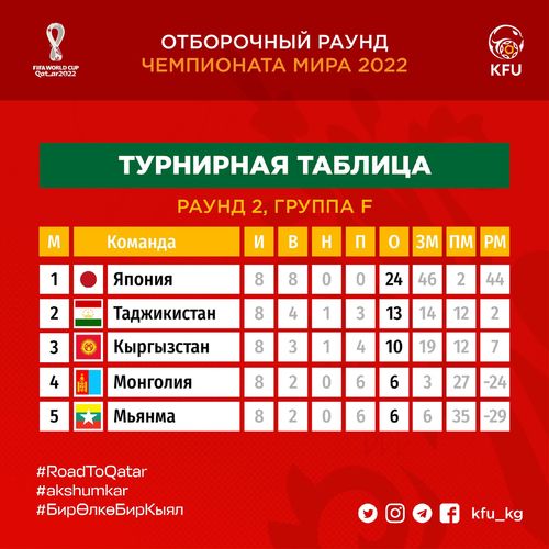 Прошедший матч с Японией стал заключительным для сборной Кыргызстана в рамках второго отборочного раунда чемпионата мира — 2022. Об этом сообщает Кыргызский футбольный союз.