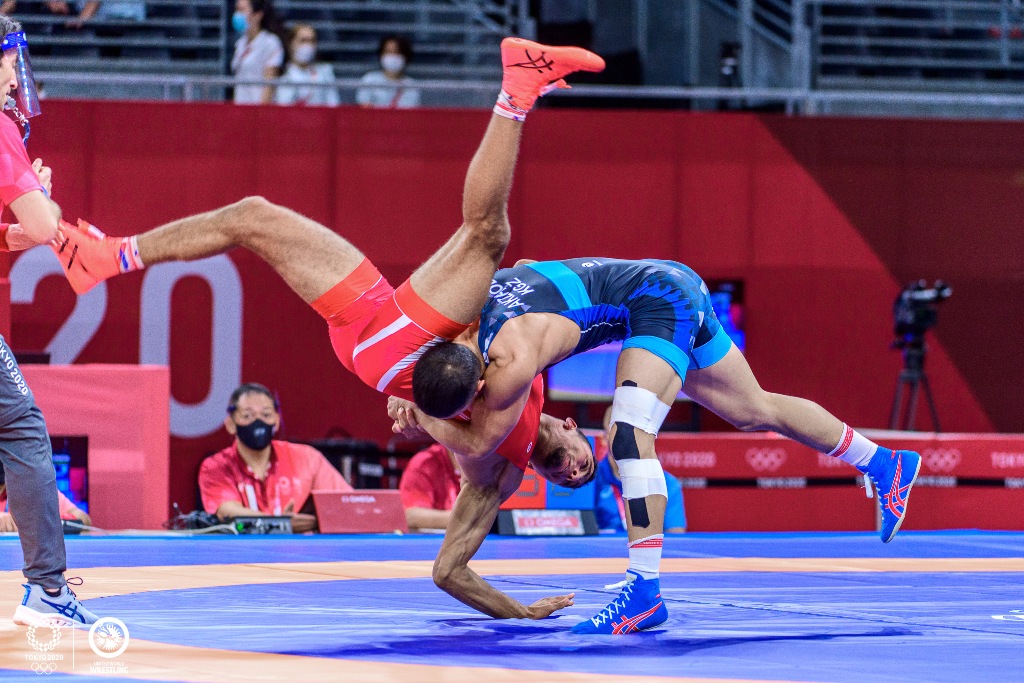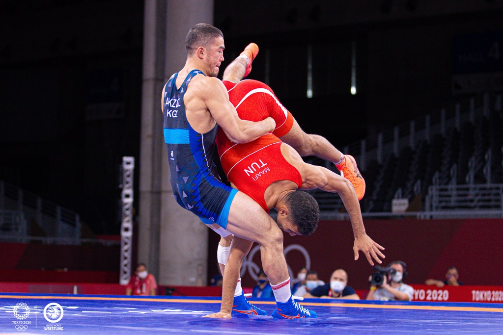 Фотографии бросков борца греко-римского стиля из Кыргызстана Акжола Махмудова, который вышел в финал на Олимпиаде в Токио, опубликовал Объединенный мир борьбы (UWW).