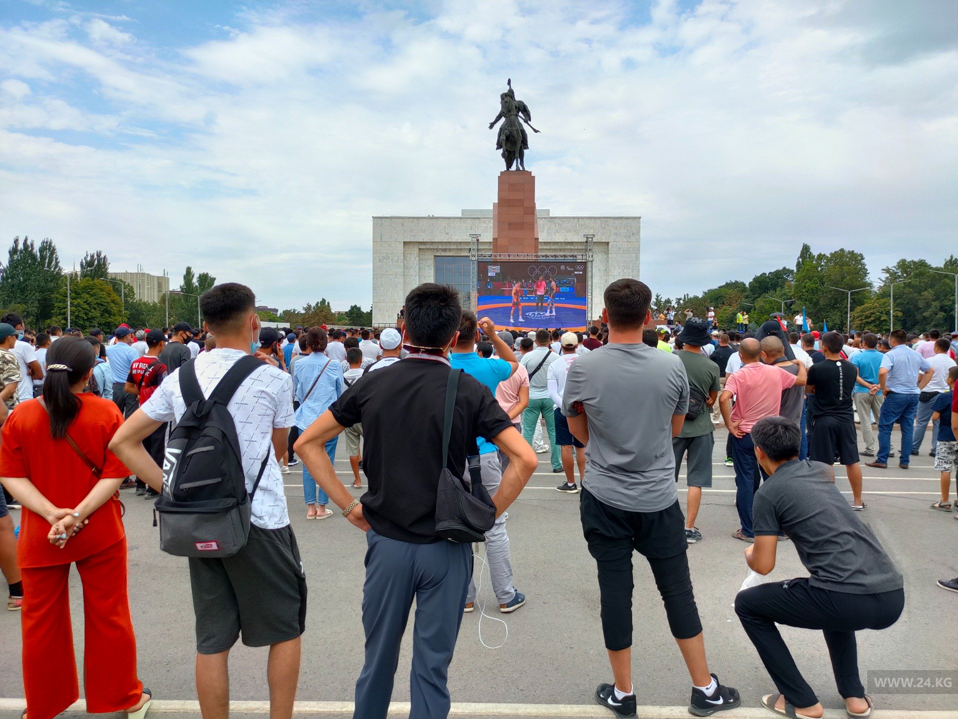 На площади собралось около 2 тысяч человек. Все они с замиранием сердца следят за поединками кыргызстанцев в Токио.