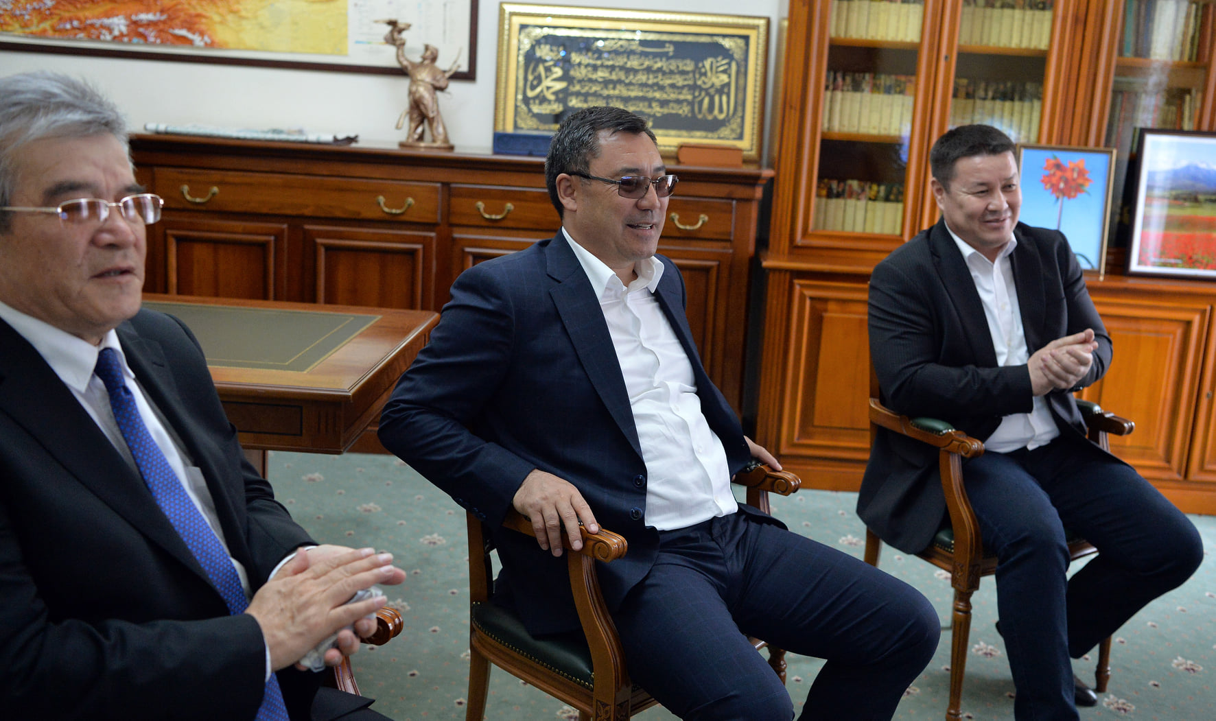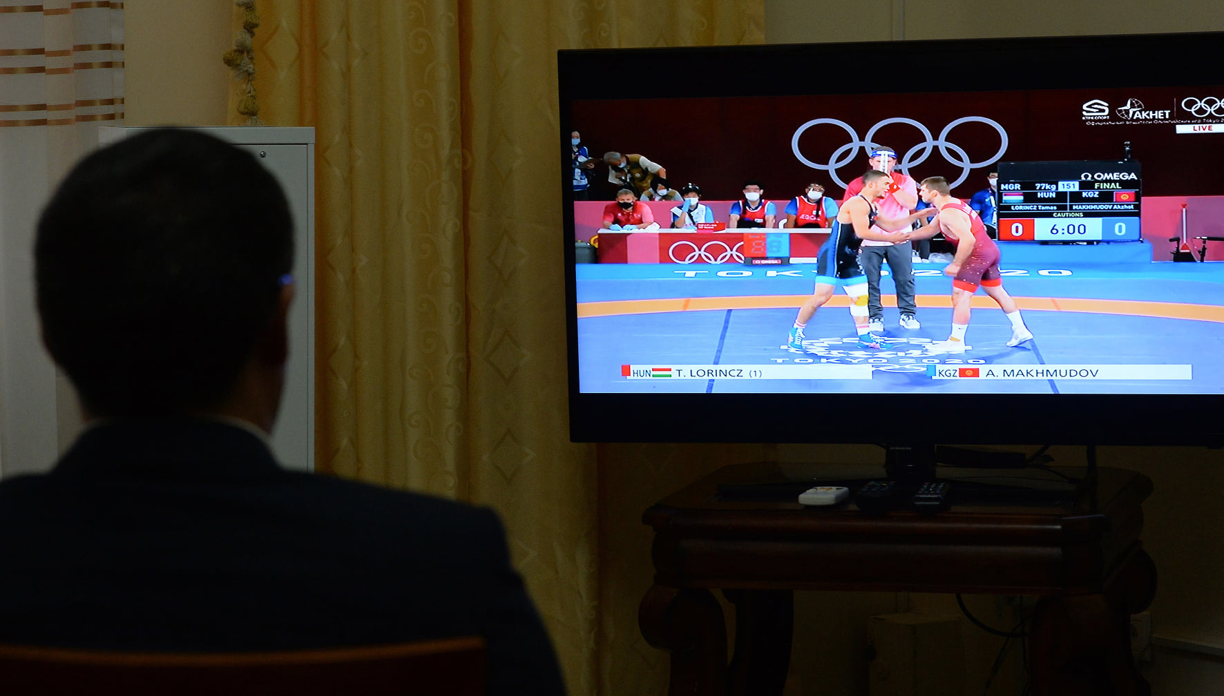 Глава государства Садыр Жапаров следил за игрой из своего рабочего кабинета вместе со спикером Жогорку Кенеша Талантом Мамытовым. Он поздравил наших олимпийцев с победой по телефону.