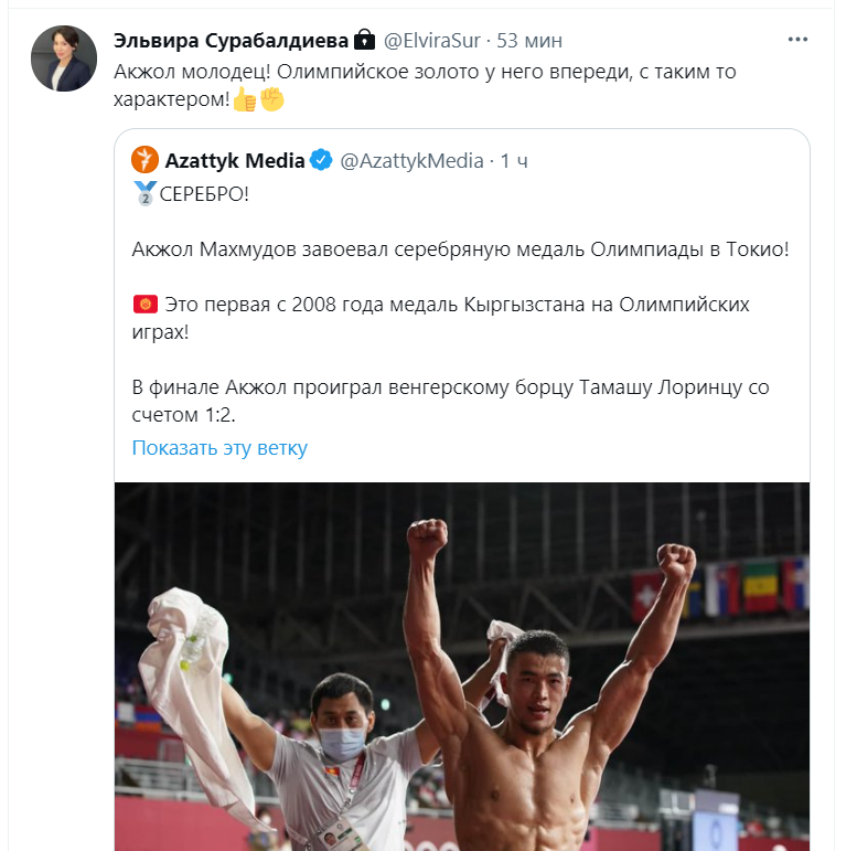 «Акжол молодец! Олимпийское золото у него впереди с таким-то характером! Мээрим молодчина! В копилке Кыргызстана бронзовая олимпийская медаль! Отлично! Эти несколько минут жесткой борьбы и столь нужного нашей стране объединяющего позитива. Рахмат! «Кыз-Бурактан» корккон мырзабызга ысык салам (Горячий привет господину, который боялся «Кыз-Бурака»)», — отметила она.
