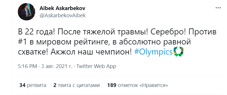 «Наши умеют побеждать не благодаря, а вопреки. Помню, знакомые борцы просили выслать борцовскую обувь и трико, так как не в чем было на больших соревнованиях выступать. Трико всегда просили двустороннее, чтобы на месте сразу менять, — красное или синее. Про питание для борцов отдельный разговор. Ребятки, давайте помогать и поддерживать наших спортсменов и спортсменок во время подготовки, все четыре года, а не только когда выступают и побеждают! Спасибо, Айсулуу, Акжол, Мээрим! Горжусь, что живу с вами в одном поколении», — написал он.