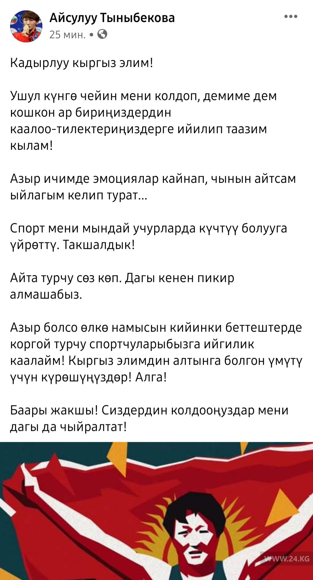 «Уважаемый мой кыргызский народ. Я преклоняюсь перед каждым, кто меня до сегодняшнего дня поддерживал и желал успехов. Сейчас меня переполняют эмоции, хочется плакать. Спорт научил меня в таких ситуациях быть сильной. Закалил. Можно говорить о многом. Позже поговорим», — написала спортсменка.