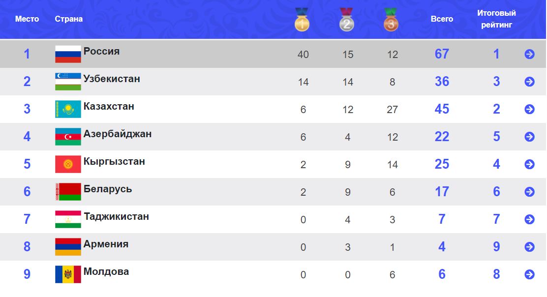 Первое место у сборной России — 40 золотых медалей, Узбекистан на втором с 14 наградами высшего достоинства, у Казахстана шесть первых мест.