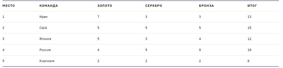 Первое место у спортсменов из Ирана — у них семь золотых медалей, у США и Японии — пять, России — четыре золота.