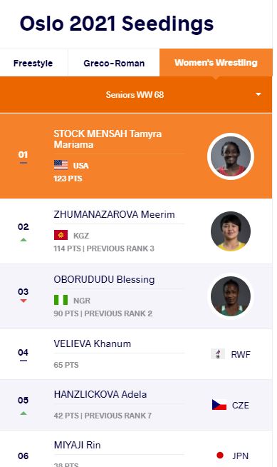 По его данным, обновленный рейтинг составили по итогам чемпионата мира, который прошел в Осло (Норвегия). Отмечается, что на первом месте в списке до 68 килограммов находится спортсменка из США Тамира Сток Менса — 123 очка, на втором Мээрим Жуманазарова — 114 очков, на третьем Блэссинг Оборудуду из Нигерии — 90 очков.Ранее президент Садыр Жапаров поздравил спортсменок Айсулуу Тыныбекову, Мээрим Жуманазарову и Айпери Медет кызы с победой на чемпионате мира по борьбе. Мээрим Жуманазарова выиграла чемпионат мира по борьбе, который проходит в Осло. В финале она одолела Рин Мияджи из Японии, уложив соперницу на лопатки (туше).