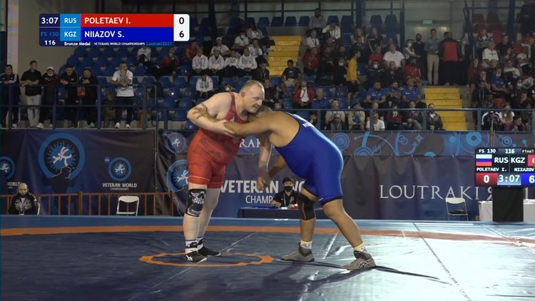 Кыргызстанец Сааданбек Ниязов в весовой категории до 130 килограммов в дивизионе E выиграл встречу за бронзовую медаль чемпионата мира по борьбе среди ветеранов, который стартовал сегодня в городе Лутраки (Греция).