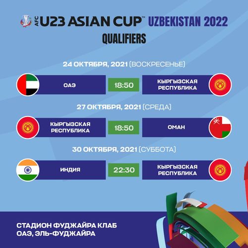 Олимпийская сборная Кыргызстана по футболу 24 октября начнет борьбу за путевку на Кубок Азии (U-23), который пройдет в 2022 году в Узбекистане. Об этом сообщили в футбольном союзе страны.