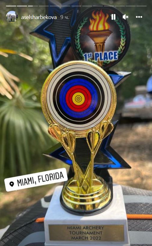 Асель Шарбекова завоевала первое место на турнире по стрельбе из лука Miami Archery Tournament. Об этом сообщила сама спортсменка в историях Instagram.