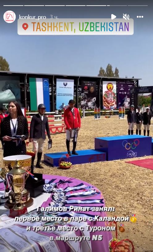 Кыргызстанец Ринат Галимов на турнире по конкуру в Ташкенте выиграл сразу две медали в одной дисциплине. Об этом сообщает konkur_pro в Instagram.