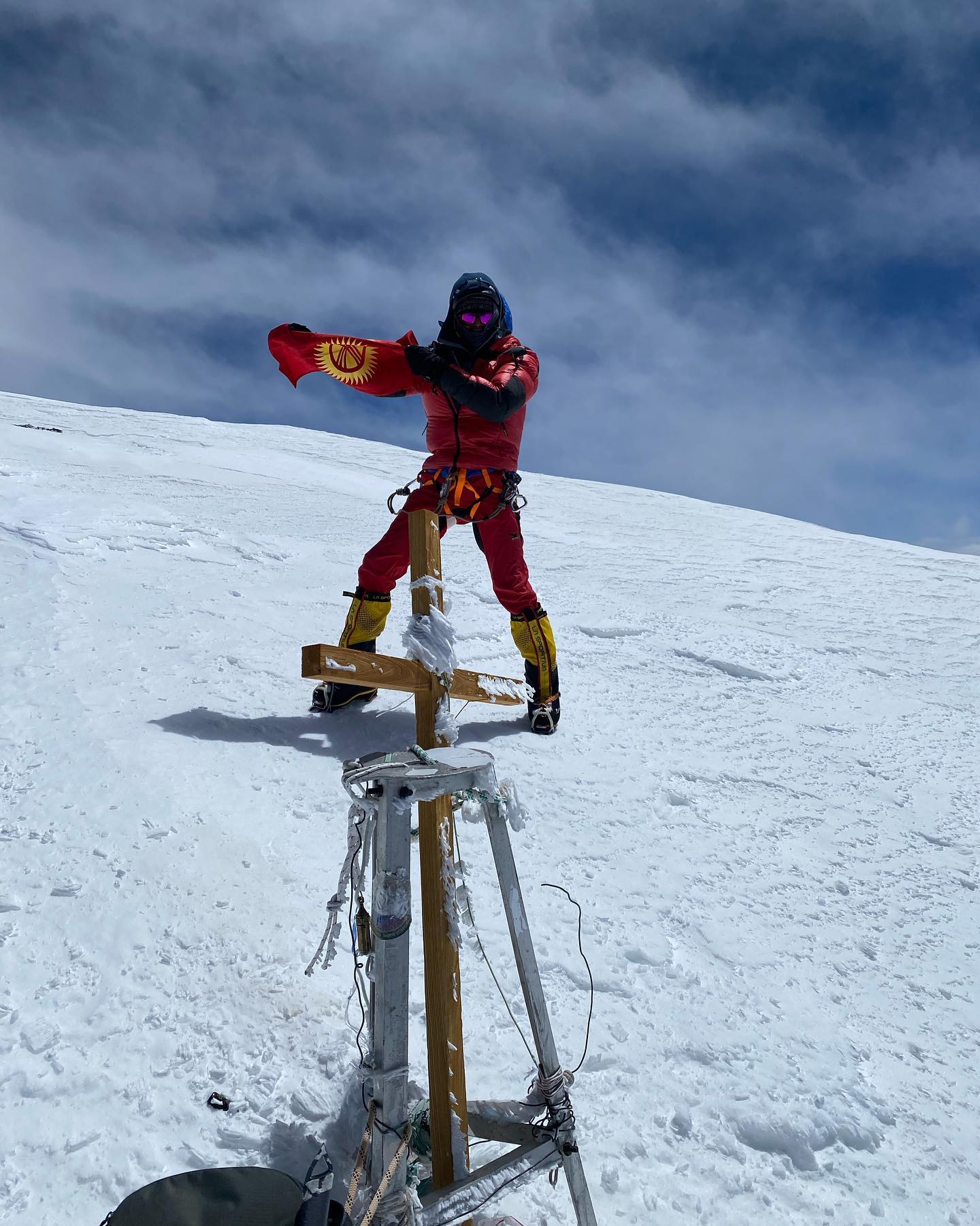 «7 тысяч 10 метров есть! Сакральная, крайне сложная и практически вертикальная вершина нашей страны. Одна из высших ее точек и без сомнения самая красивая вершина мира. Самая восточная точка Кыргызстана, именно с «Хана» начинается солнце, можно сказать — гора восходящего солнца. Здесь начинается и первый километр нашей дорогой страны. Про историческое и духовное значение Хан-Тенгри можно написать целую книгу. Помните об этом. Гора была во всех отношениях для меня сложной. Высота, попали в жуткую непогоду, ветер 50 километров в час, снегопад, холод! Участвовали во время восхождения в спасательной операции иранской команды. Все было против нас, но мы сумели! 25 июля в 12.30 я был там и там был наш кыргызский флаг», — написал он на своей странице в Facebоok.