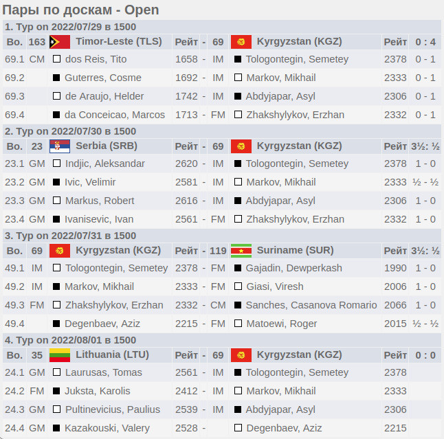 Согласно турнирной таблице, кыргызстанцы из мужского состава сборной обыграли команду Восточного Тимора и Суринам. Наши шахматисты проиграли соперникам из Сербии.