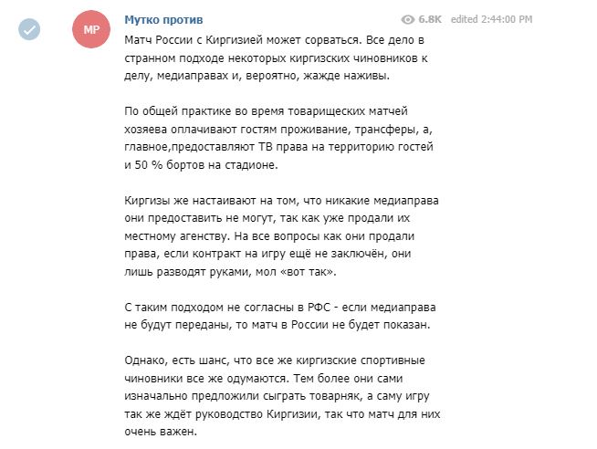 Матч между сборными России и Кыргызстана находится под угрозой срыва. Об этом сообщило издание «Спорт-Экспресс» со ссылкой на Telegram-канал «Мутко против».