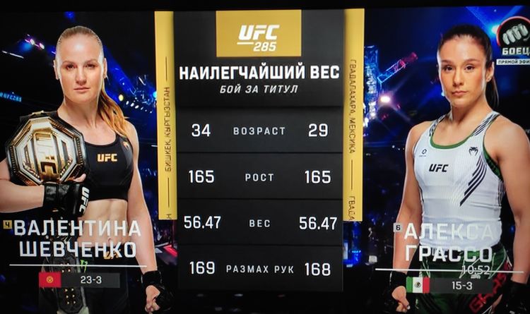 В соглавном поединке турнира UFC 285 в Лас-Вегасе (Невада) состоялся бой в наилегчайшем весе между кыргызстанкой Валентиной Шевченко и Алексой Грассо из Мексики.