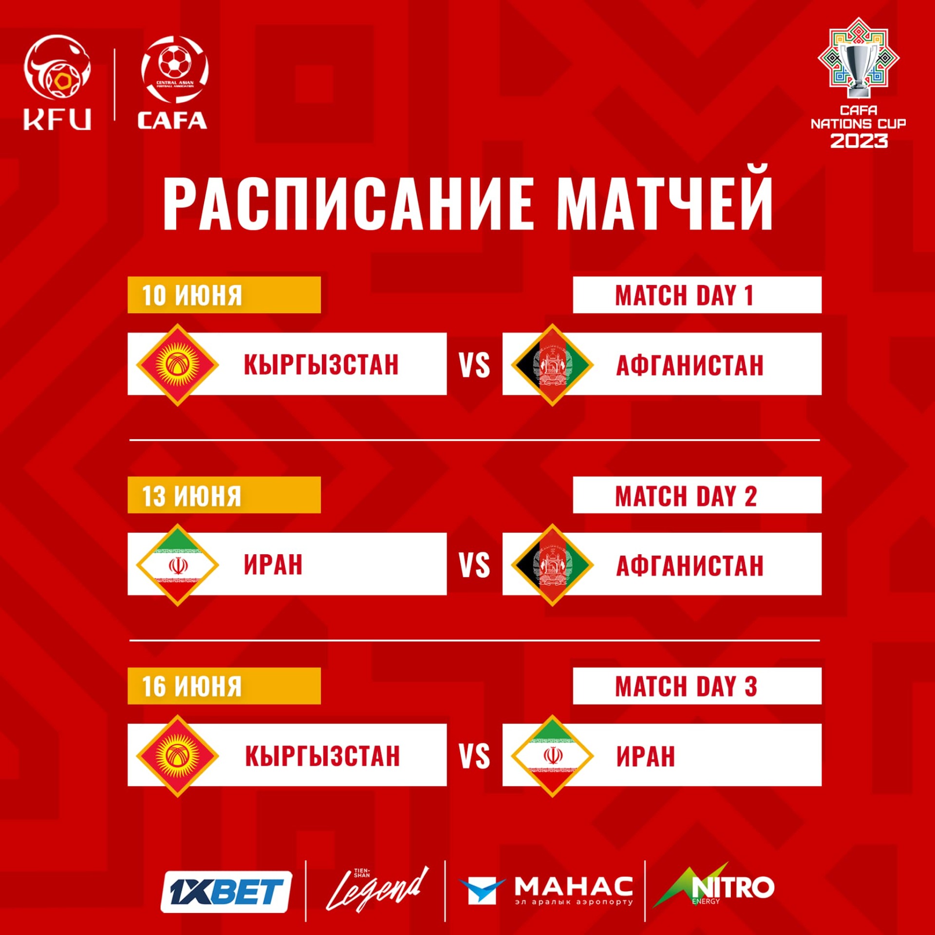 Матчи нашей группы пройдут в Бишкеке — 10, 13, 16 июня, а Ташкент примет группу А — 11, 14, 17 июня.
