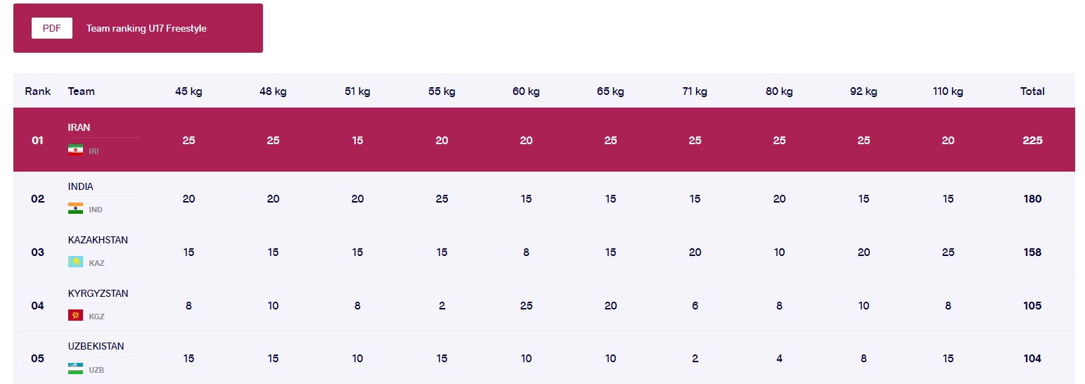 Кыргызстанцы завоевали две медали: Омурбек Асан уулу — золотую и Рустамжан Кахаров — серебряную. Сборная КР заняла четвертое общекомандное место. Первыми стали спортсмены из Ирана. На втором месте борцы из Индии, замкнул тройку Казахстан.