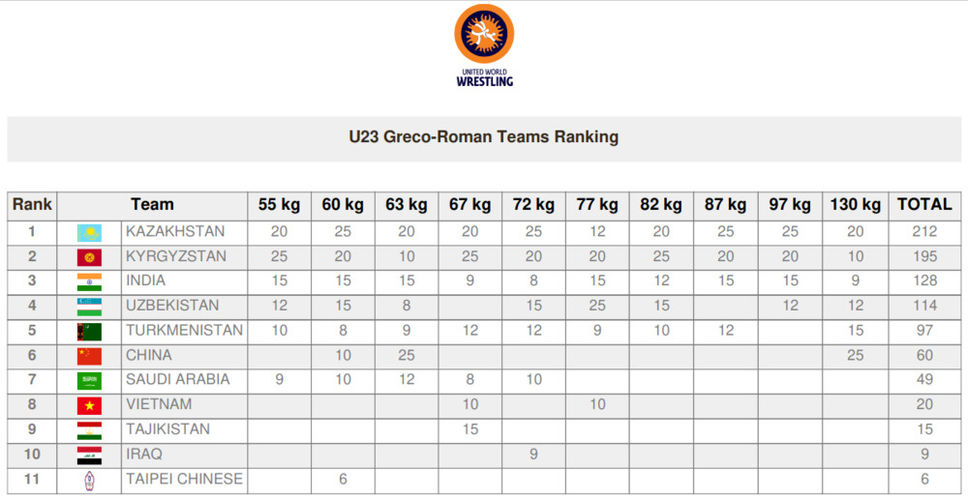 Кыргызстанцы завоевали три золотые и пять серебряных наград, заняв второе общекомандное место. Первыми стали спортсмены из Казахстана. Замкнули тройку борцы из Индии.