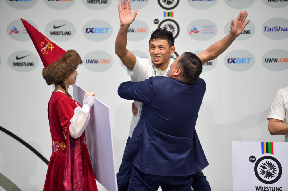 Камчыбек Ташиев поздравил борцов, а Бекзата Алмаз уулу даже обнял и поднял, разделяя радость победы.