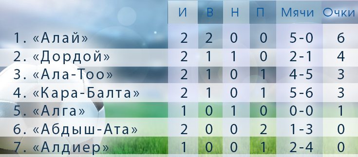 По ее данным, 16 марта состоялись три матча национального первенства. «Алай» на своем поле со счетом 4:0 переиграл нарынский «Ала-Тоо». «Кара-Балта» в Бишкеке одолела куршабский «Алдиер» - 4:2. Столичный «Дордой» взял верх над кантской «Абдыш-Атой» - 2:1.