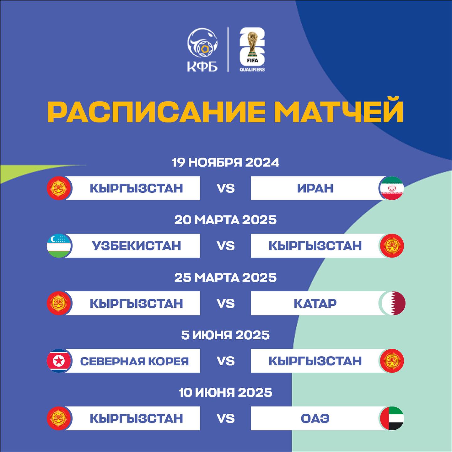 В сентябре стартует третий раунд отборочного этапа чемпионата мира 2026 года в зоне Азия. Кыргызский футбольный союз опубликовал в соцсетях график игр сборной страны.