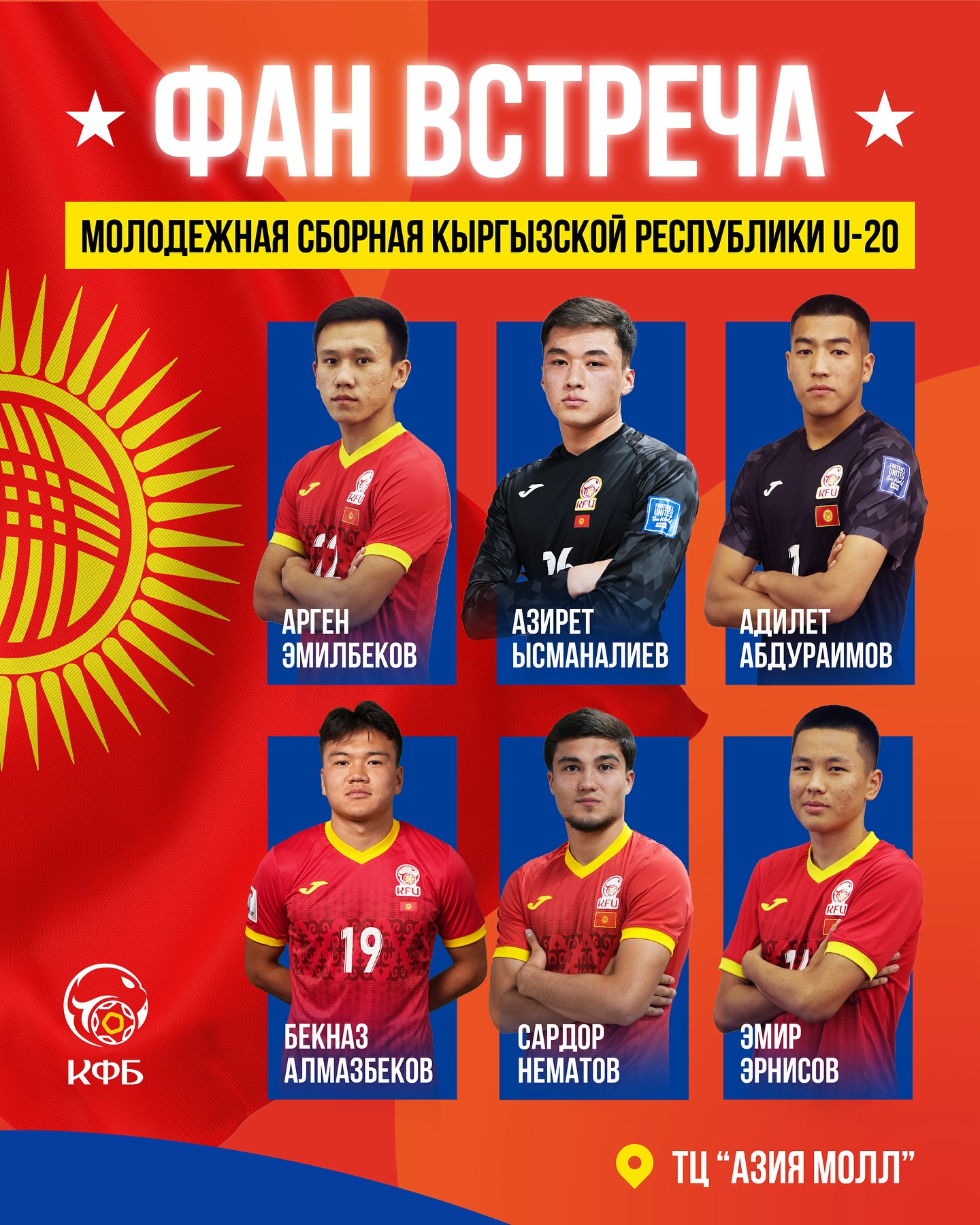 С болельщиками встретятся игроки сборной КР U-20 Бекназ Алмазбеков, Сардор Нематов, Арген Эмилбеков, Эмир Эрнисов, Азирет Ысманалиев и Адилет Абдураимов.
