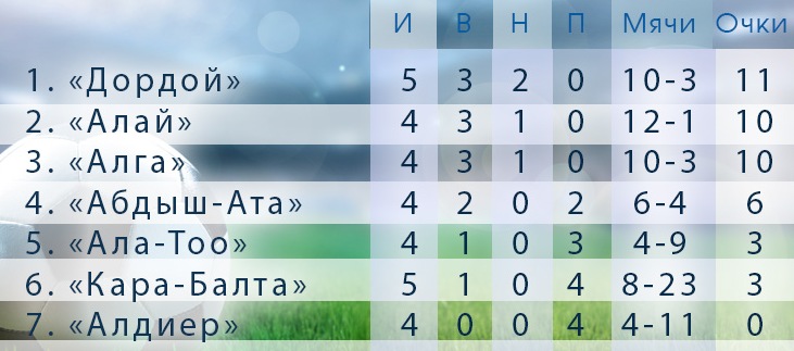 Как сообщается, «Дордой» (11 очков) по-прежнему возглавляет турнирную таблицу. Далее следуют «Алай» и «Алга» (по 10 очков).