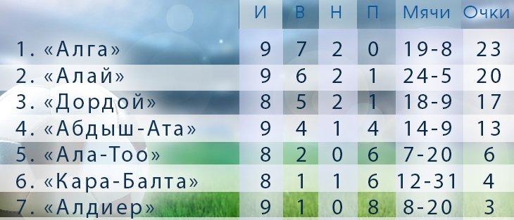 Как сообщается, «Алга» (23 очка) идет во главе турнирной таблицы. Далее следуют «Алай» (20 очков) и «Дордой» (17 очков).