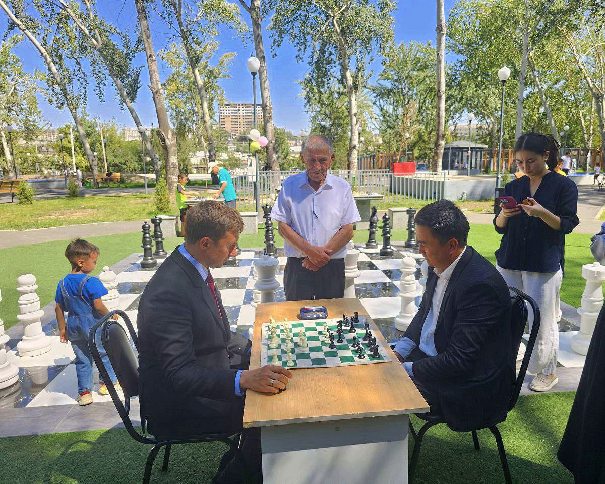 Шахматный праздник состоялся и в Джалал-Абаде. Здесь организовали партию между юными шахматистами Айбийке Коконбаевой (2012 года рождения) и Элмирбеком Ашимовым (2015 года рождения) и дуэтом Сергей Карякин и Николай Валуев.