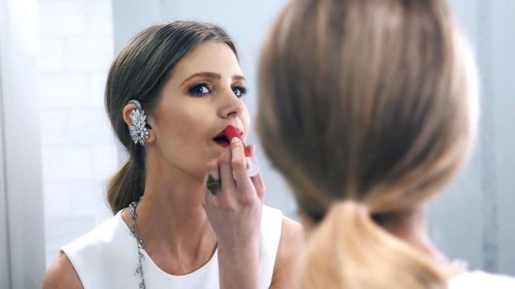 Серьга LUXE выглядит как небольшая брошь и не требует прокалывания уха. У нее есть специальная ножка, которая держится за ухом, а в ухо вставляется динамик.