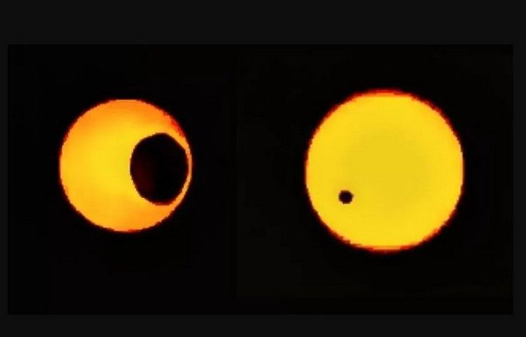 Деймос меньше Фобоса и находится дальше, он кажется крошечным и темным, медленно «плывущим» между Солнцем и Марсом. Фобос больше, ближе и менее регулярен в создании эффектного силуэта на фоне Солнца.