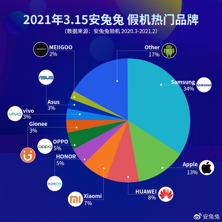 Третье место занимает компания Huawei, смартфоны которой подделывают в 8 процентах случаев, зафиксированных AnTuTu. Четвертое место с результатом 7 процентов у Xiaomi. Далее идут Honor, Oppo, Gionee, Vivo и Asus.