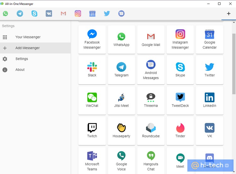 Еще один сервис со схожим функционалом — All-in-One, который поддерживает 55 различных приложений. Все наиболее популярные мессенджеры здесь есть.