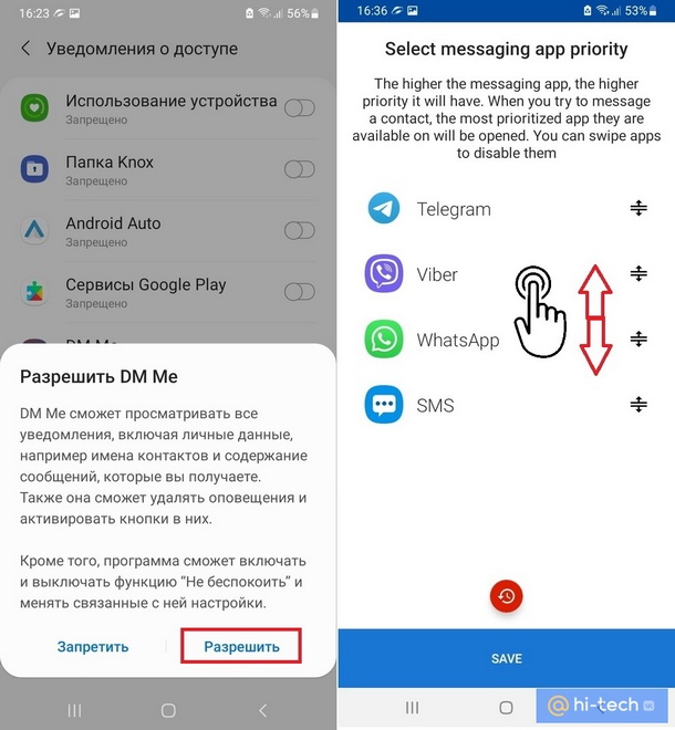 Чтобы начать пользоваться, скачайте приложение DM Me из магазина Play Маркет, выдайте ему необходимые разрешения на получение уведомлений и разместите ваши мессенджеры в списке сверху вниз в порядке их значимости.