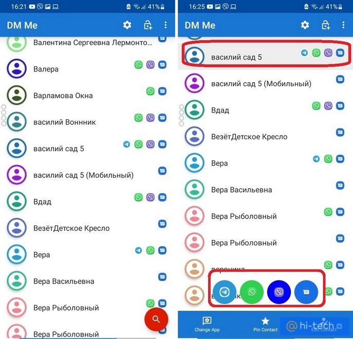 Если нажать на фотографию контакта, то DM Me сразу предложит на выбор мессенджеры, которые используете вы и ваш собеседник. Для комфортного общения контакты можно перемещать в избранные, чтобы они всегда находились вверху списка.