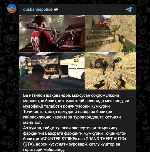 В Таджикистане запретили GTA и Counter-Strike за пропаганду жестокости. Об этом сообщается в Telegram-канале полиции Душанбе.