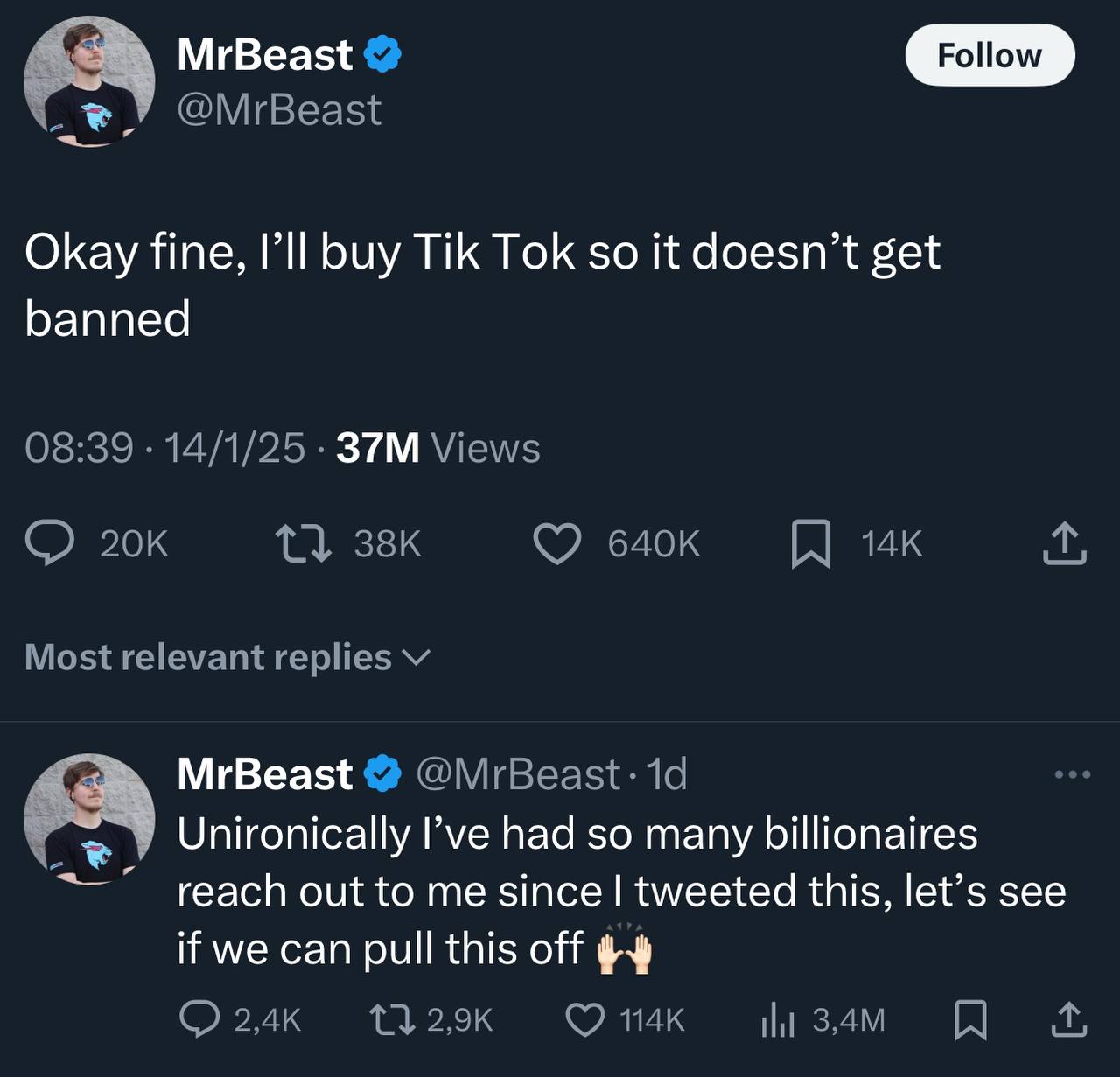 «Только что вышел со встречи с группой миллиардеров. TikTok, мы настроены серьезно. Вот мой адвокат, у нас уже готово предложение для вас. Мы хотим купить платформу. Америка заслуживает TikTok! Дайте мне место за столом переговоров, позвольте мне спасти эту платформу, TikTok!» — заявил Джимми Дональдсон.