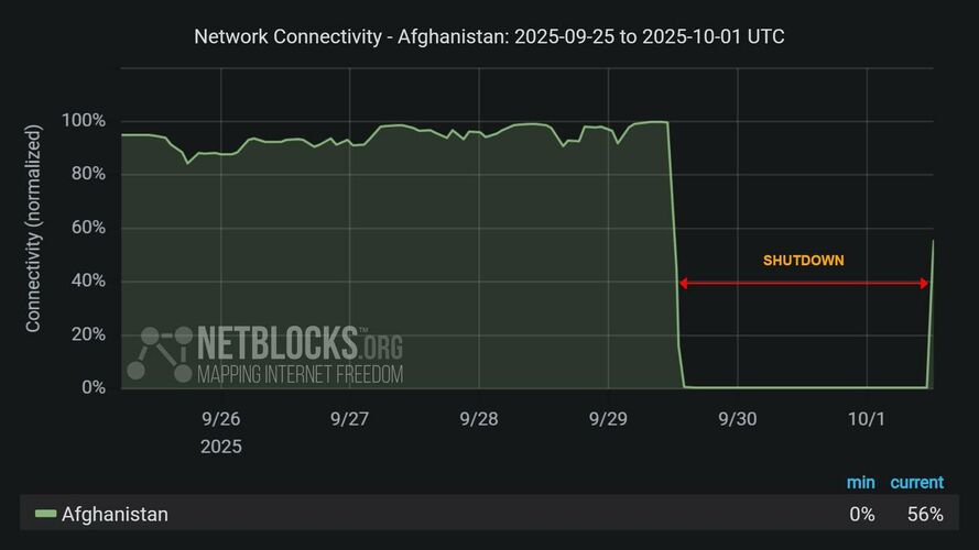 По ее информации, данные о работе сети в режиме реального времени свидетельствуют о частичном восстановлении интернет-соединения в Афганистане на фоне протестов после двухдневного отключения связи по всей стране.