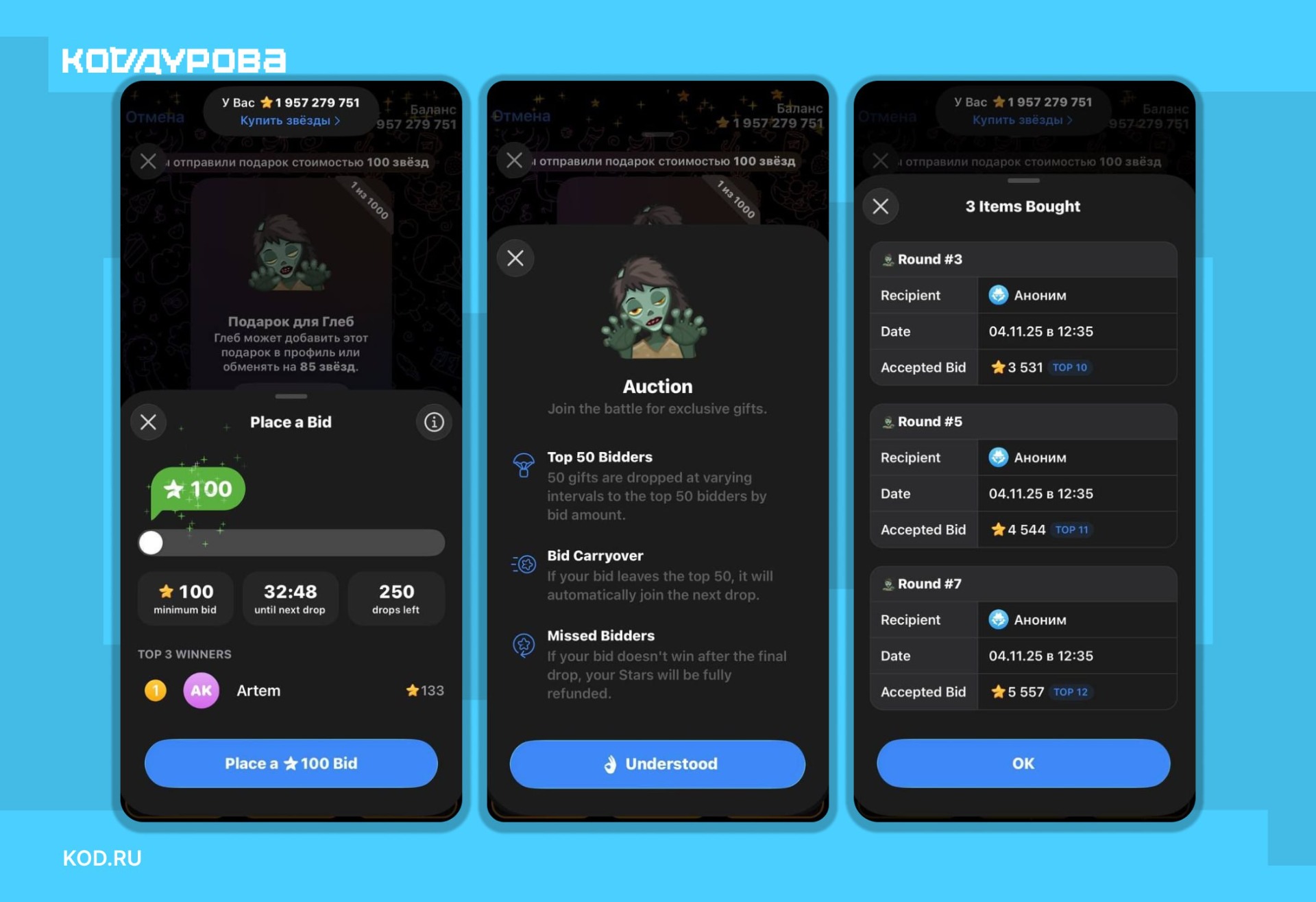 Механизм торгов предполагает, что пользователи, занявшие позиции в Топ-50 по размеру сделанной ставки, получат соответствующую партию подарков. Ставки остальных участников будут перенесены в следующий раунд, где будет разыграна очередная партия. Этот процесс продолжится до тех пор, пока все доступные подарки не будут распределены.