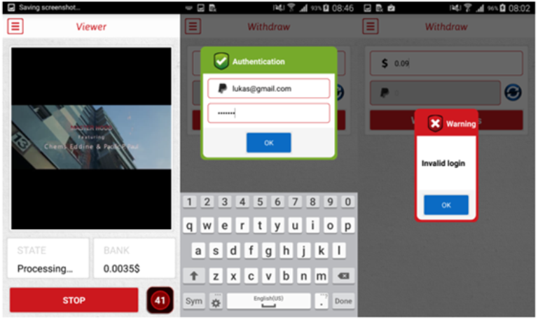 Накопив $0,09, исследователи попытались перевести их на PayPal, для чего в приложении предусмотрена специальная форма авторизации. Получить «зарплату» не удалось: после ввода логина и пароля приложение выдавало сообщение об ошибке, в то время как учетные данные PayPal отправлялись на удаленный сервер разработчиков.