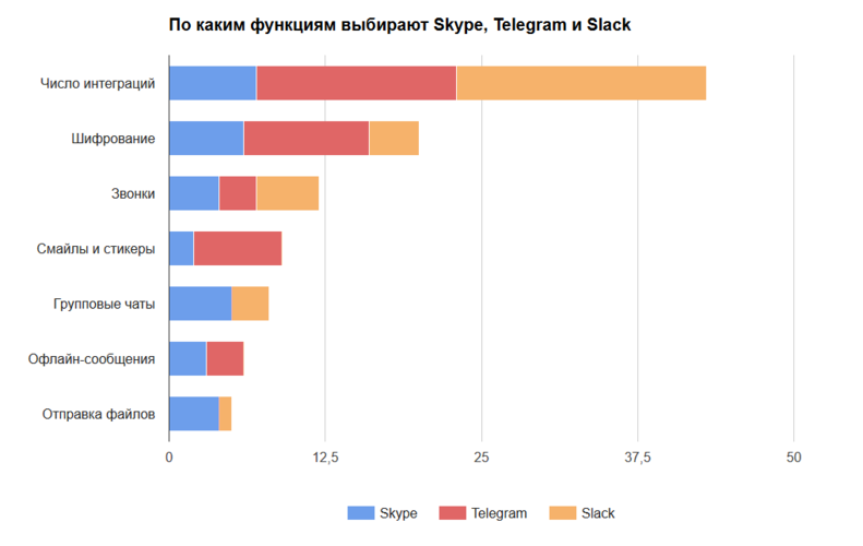 При выборе мессенджера для бизнеса пользователей интересует шифрование сообщений и доступные интеграции. Исходя из этих параметров, в организациях, как правило, выбирают Skype, Telegram или Slack.