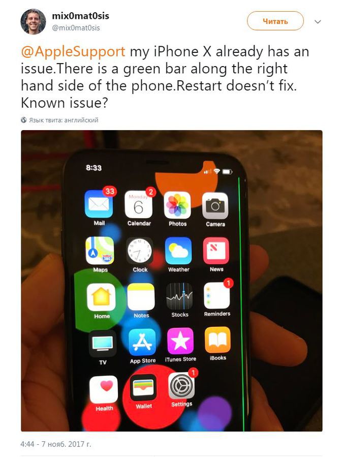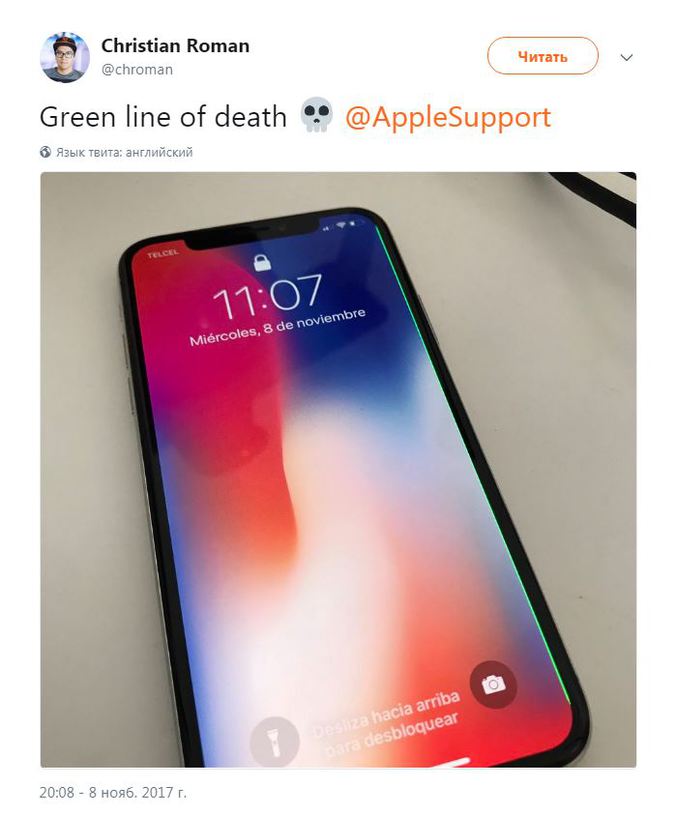 Владельцы самого дорогого из смартфонов от Apple — iPhone X — завалили Сеть жалобами на дефект дисплея устройства. Он проявляется в виде яркой зеленой линии по его правому краю, написали зарубежные СМИ.