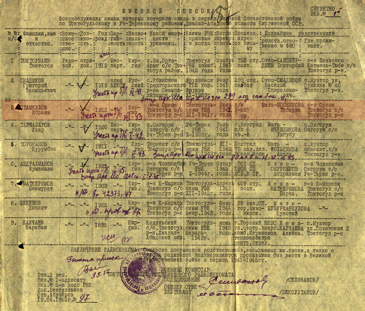 Согласно базе данных, Ибраим Стамкулов был призван в декабре 1941 года Токтогульским военкоматом (Киргизская ССР, Джалал-Абадская область, Токтогульский район). Связь с ним прервалась в июле 1942 года. Мать – Т.Бообекова.