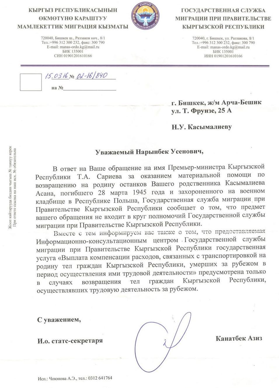На какое-то время поиски пришлось оставить: работа, семья. Но шесть лет назад он снова взялся за дело. Удалось выяснить, что в марте 1945 года Асан Касымалиев получил ранение и умер в городе Гросс-Стрелице в Германии (ныне Польша). Позже его перезахоронили в городе Кендзежин-Козле (номер могилы 358).